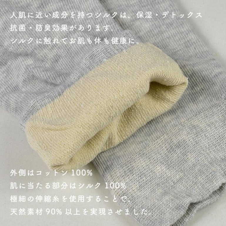 内側はスパンシルク: 肌に直接触れる内側には、高級スパンシルク(絹紡糸)を100%使用。シルク特有の光沢とサラッとした感触で、足を快適に保ちます。この素材はデトックス効果もあり、汗をかいてもベタつきを抑えます。