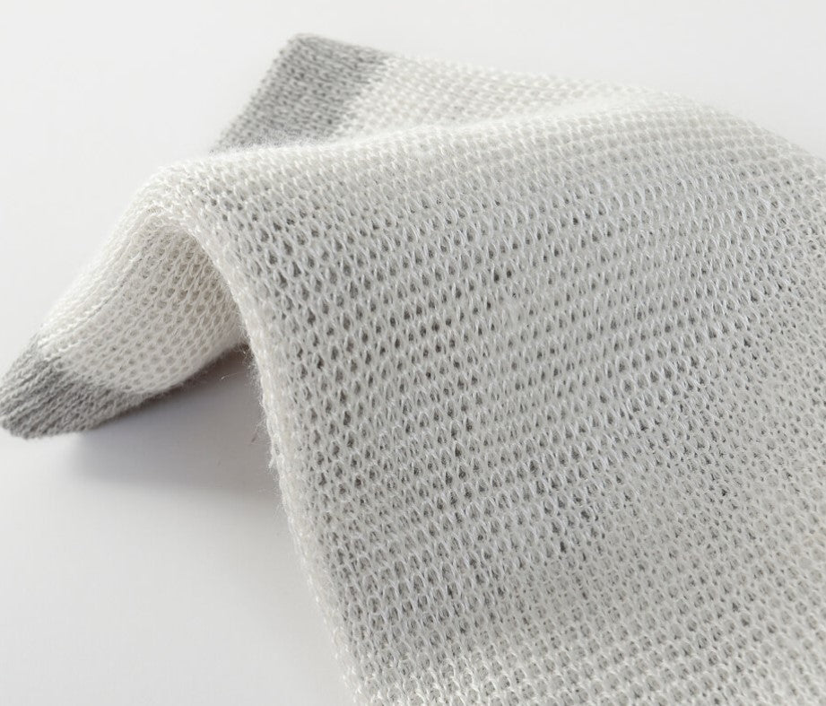 シルクとコットンを続けて筒状に編んだ後、一枚ずつ手作業で二重にしています。