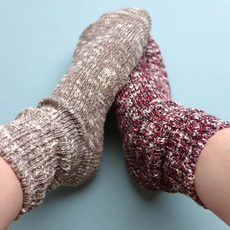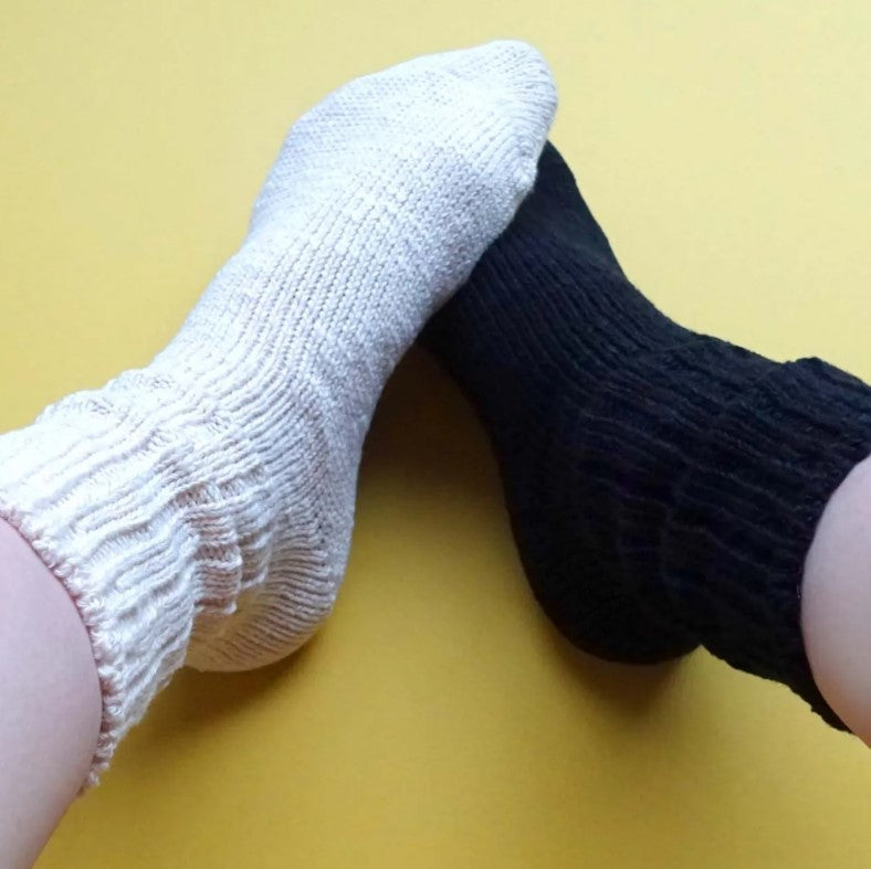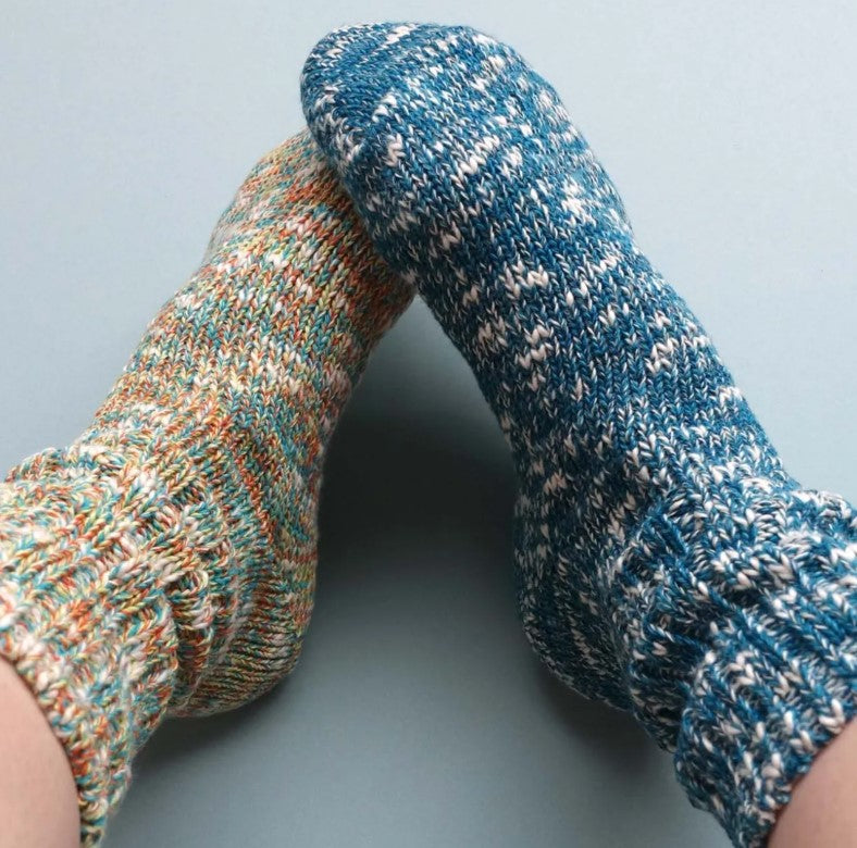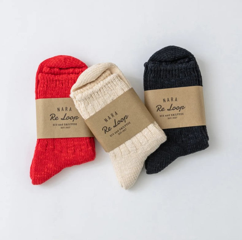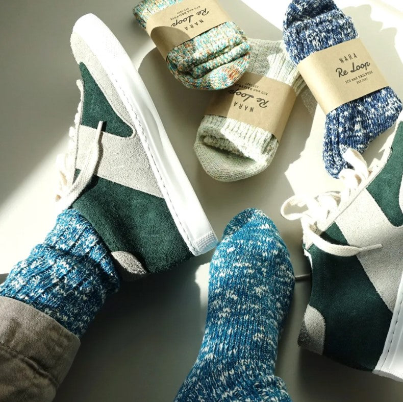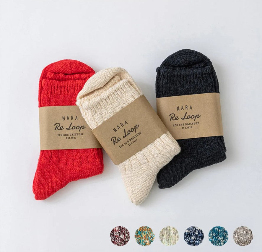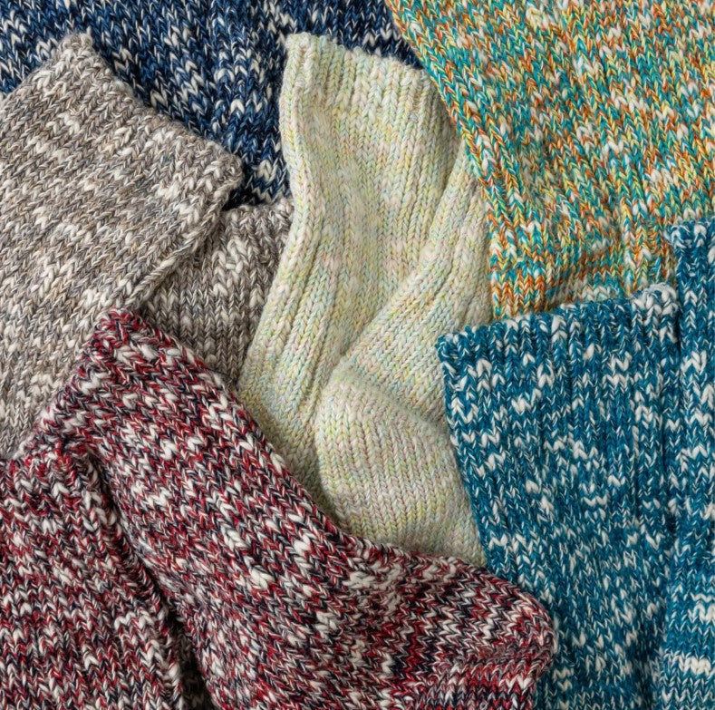 リサイクルコットン/スラブミックスの靴下は、所々ポコポコとなった太さが不規則なスラブ糸(通称:雲糸)という糸と、日本国内の紡績工場で糸を紡ぐ際に出た、落ちわたを利用して作るリサイクルコットンの糸と、さらに綿糸の中でも柔らかく風合いの良い綿コーマ糸の3種類の綿糸を掛け合わせて編みたてています。
