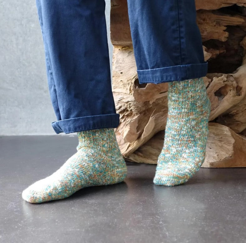 その掛け合わせた糸を、国内では希少となったローゲージ(目の粗い編み目)のダブルシリンダー機で、どっしりと編みあげた雰囲気のあるソックスです。